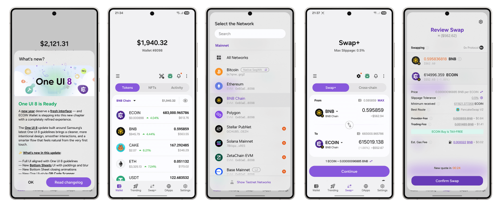 For those unfamiliar, One UI is Samsung’s custom interface built to make Android more intuitive, beautiful, and accessible. It focuses on clarity and simplicity — values that perfectly align with the mission of ECOIN Wallet. With this update, we’ve fully embraced the One UI 8 guidelines to ensure your crypto experience is as polished as your flagship device.