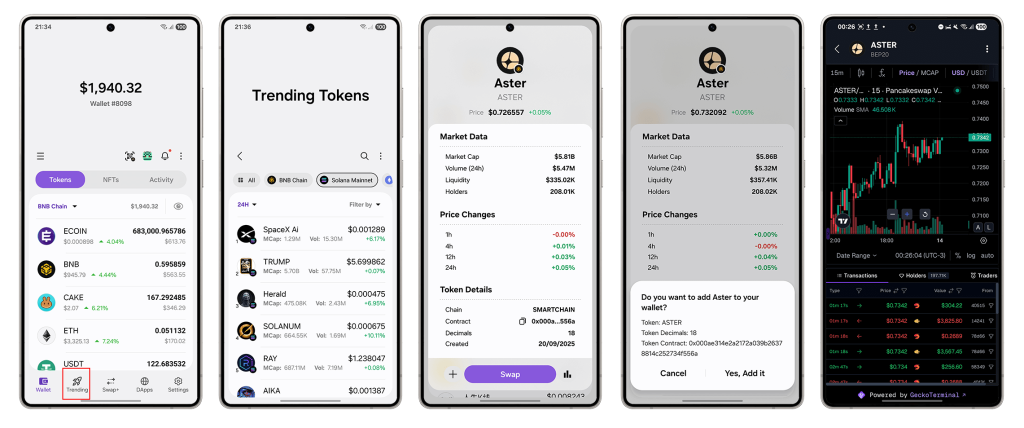 We’ve also introduced Trending Tokens 📈. Now, you can monitor the market across BNB Chain, Ethereum, Polygon, and Base without leaving the app. Filter by timeframe, check market cap, or swap directly from the trending list. It’s DeFi intelligence, simplified.