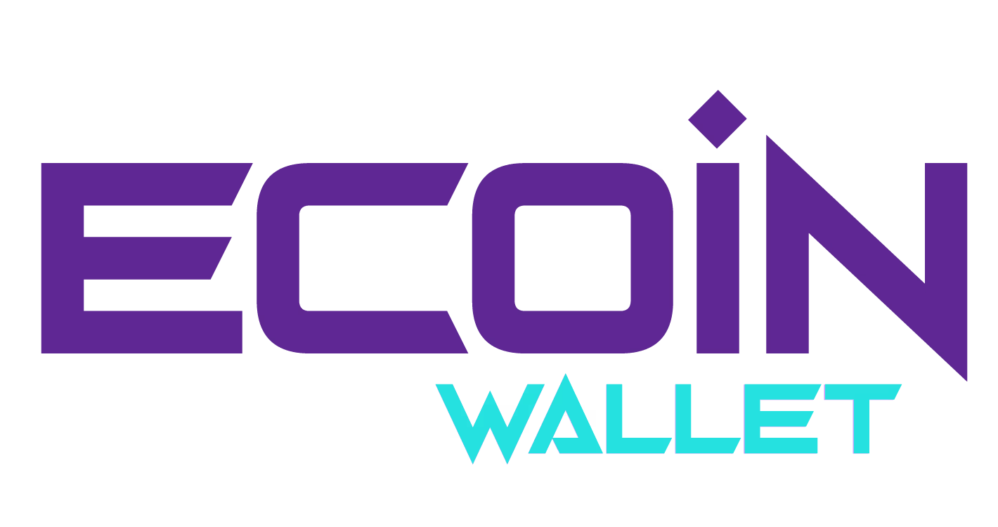 The word "WALLET," below "ECOIN," complements the visual identity, conveying trust and security. The simplicity of the logo allows it to be easily recognized, and it reflects the values and services of Ecoin Wallet, helping to build recognition and trust among users.