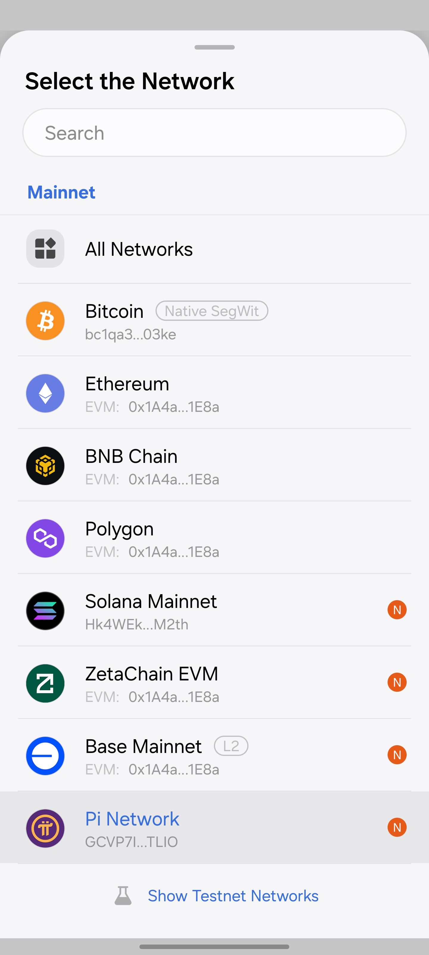 - Network Selector: Easily switch between Pi Network, Ethereum, Bitcoin, and other supported chains.