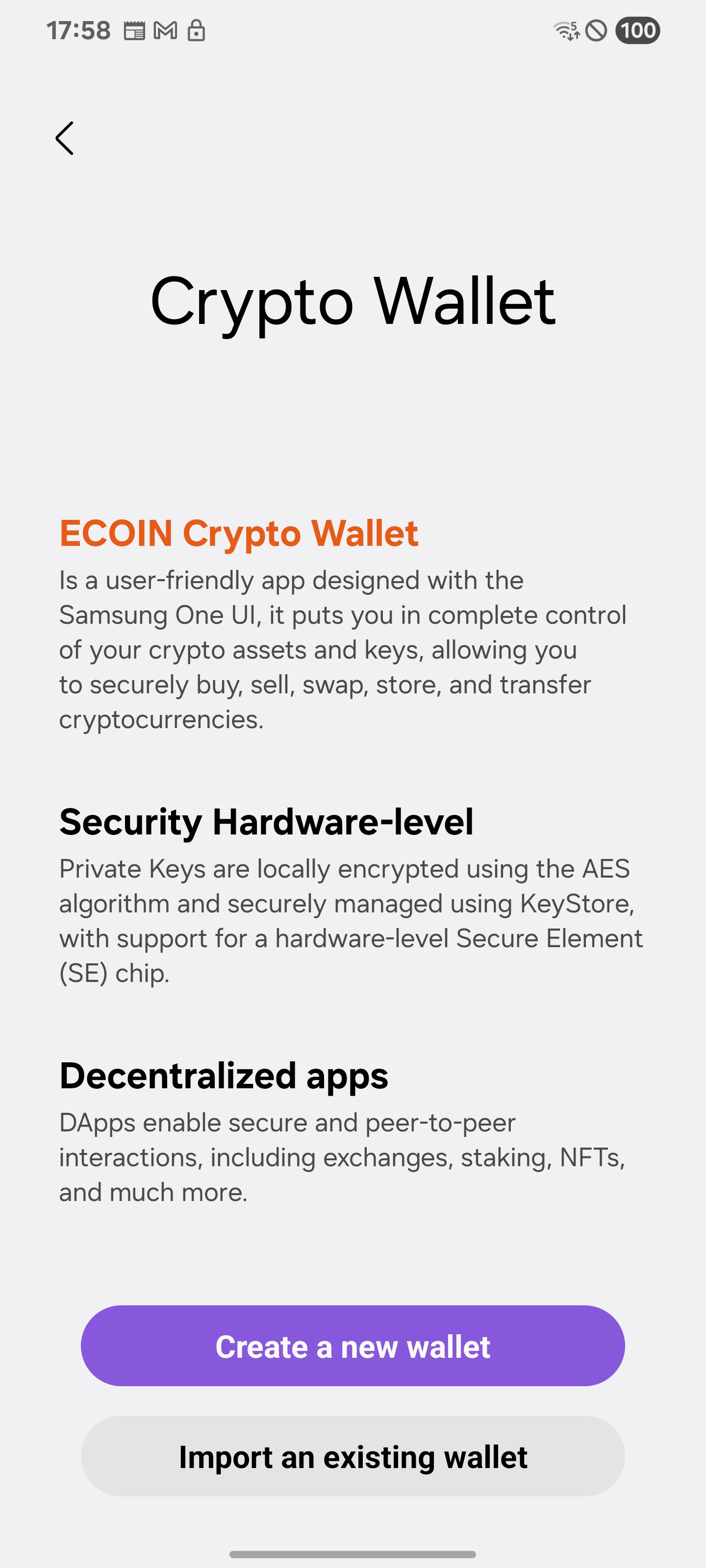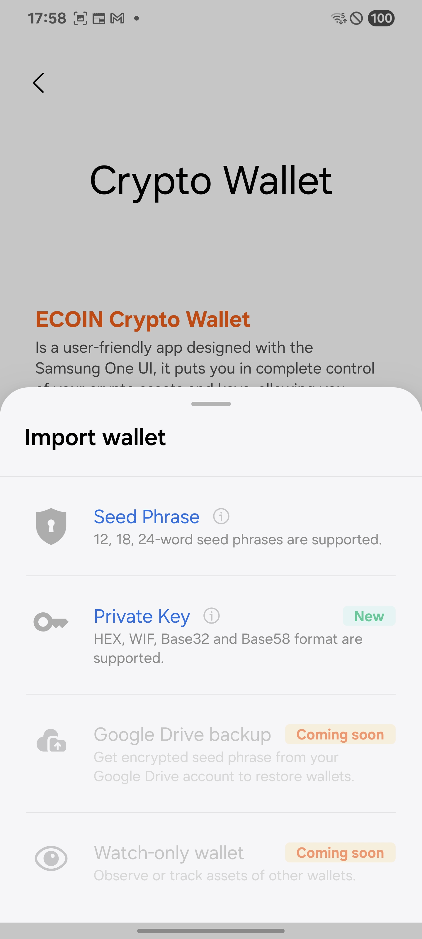 - Seed Phrase Support: Ecoin Wallet supports importing wallets with 12- and 24-word seed phrases, offering a secure and straightforward method to restore or migrate wallets.