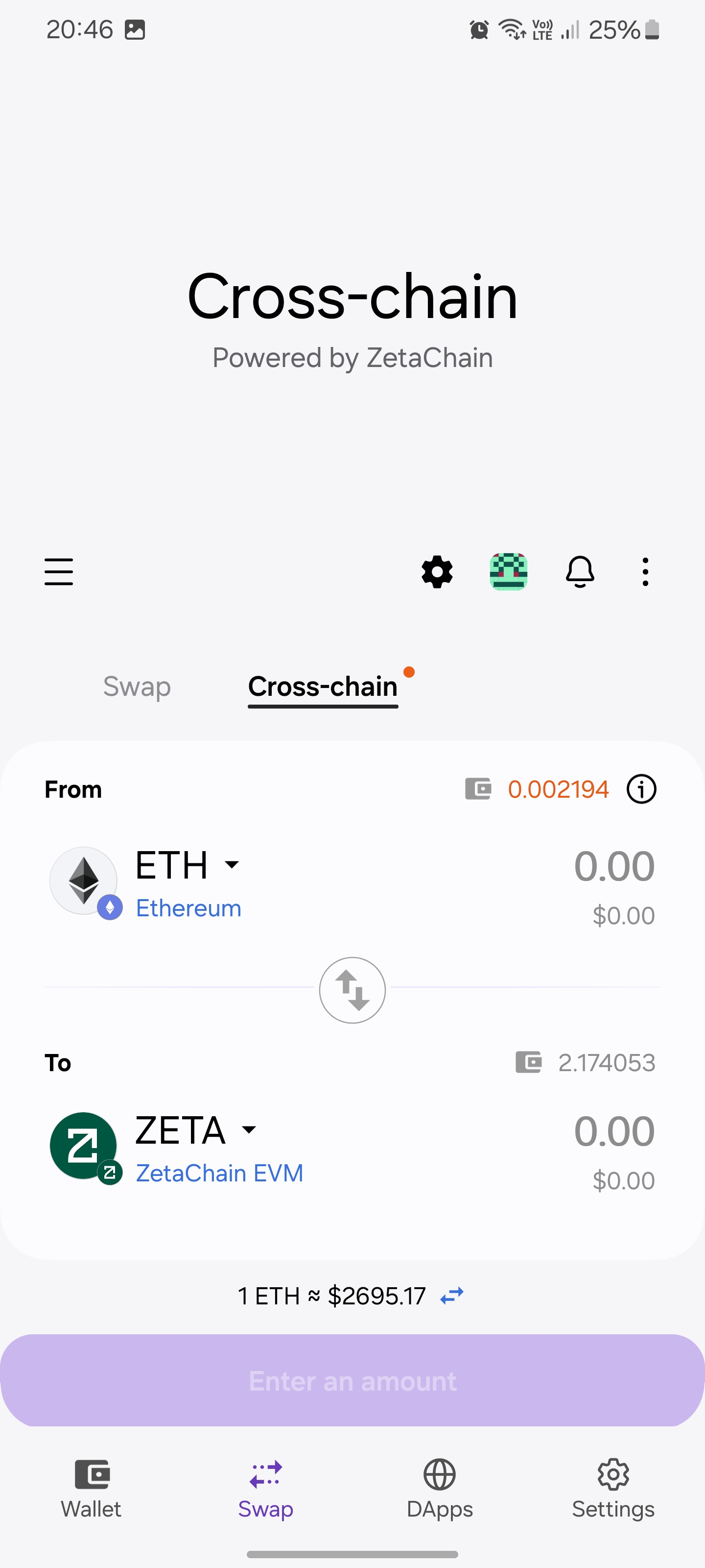 Ecoin Wallet provides advanced cross-chain interoperability directly through its Swap feature, enabling users to bridge tokens seamlessly across multiple major networks, including Bitcoin, BNB Chain, Ethereum, Polygon, Base, ZetaChain, and ZRC20 tokens. This functionality is powered by ZetaChain, the leading technology in cross-chain interoperability, ensuring a secure and efficient experience.