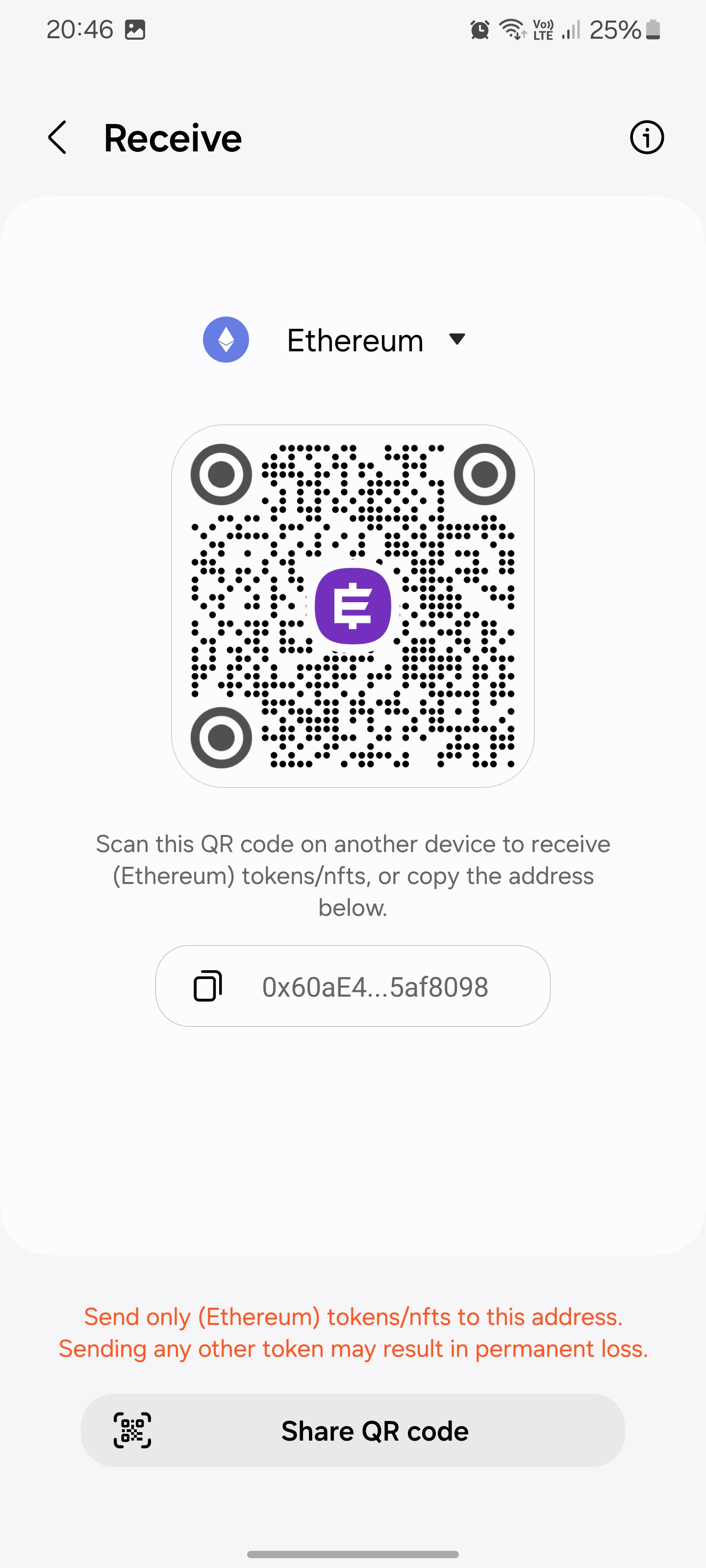 Ecoin Wallet makes it easy to receive Ethereum (ETH) and any ERC20 tokens, thanks to the EVM (Ethereum Virtual Machine), which uses the same address for both. Whether you're receiving ETH or ERC20 tokens, the process is seamless and convenient.
