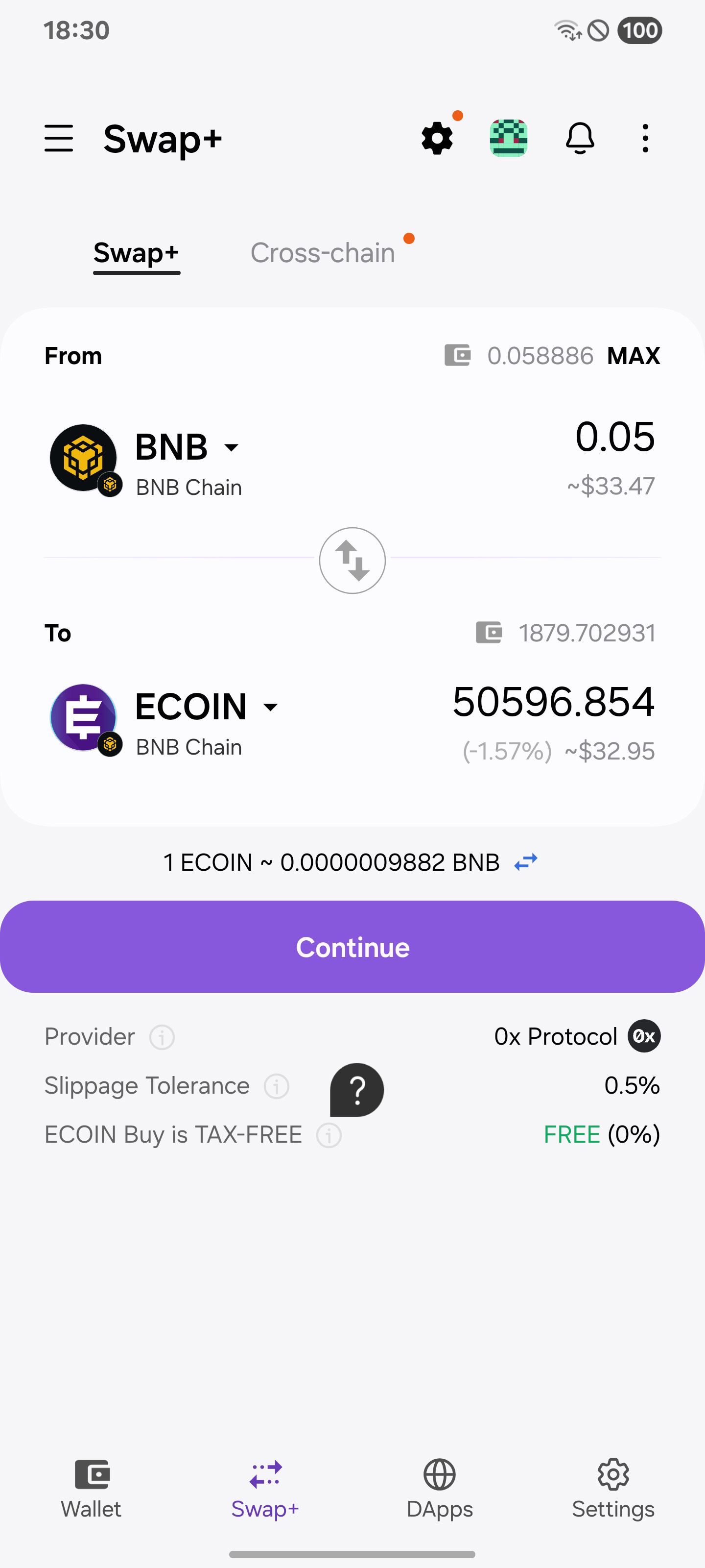 ECOIN Wallet features a Smart Swap+, powered by 0x; allowing users to seamlessly exchange tokens across 130+ DEXs with ease.