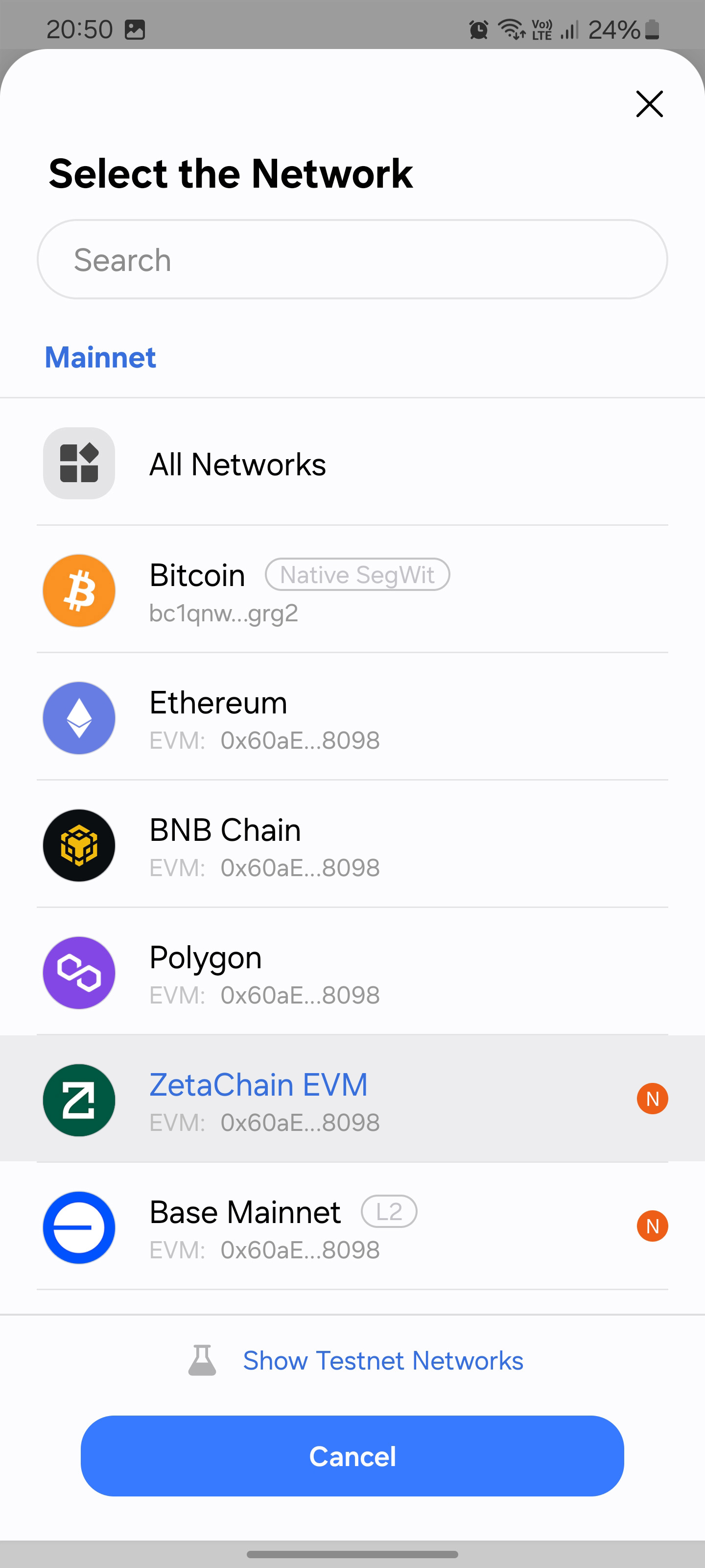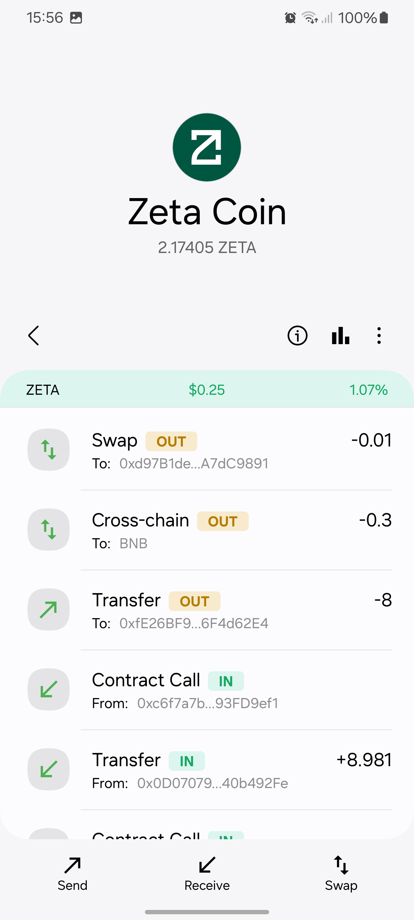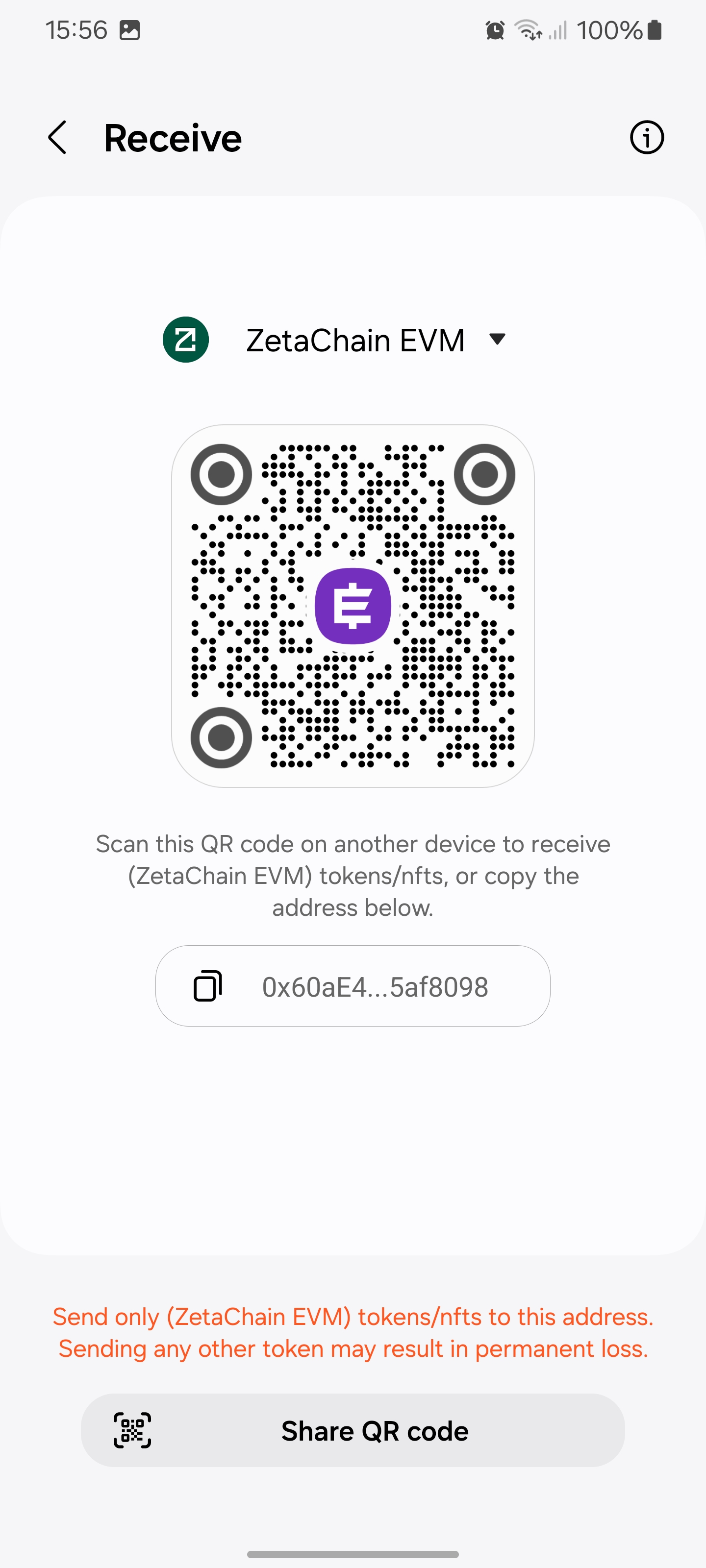 - ZRC20 Token Support: You can receive any ZRC20 tokens directly to the same ZetaChain address, making it easy to manage all your tokens in one place.